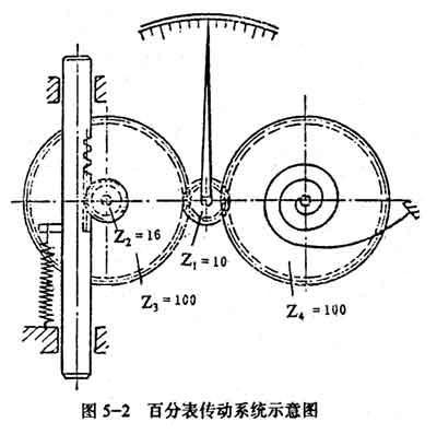 百分表的傳動系統最常見的是二級傳動,如圖5-2所示,其傳動原理如下:當測桿被工件抬高1毫米時,齒條上升1.6齒,由于齒輪Z2是16齒所以齒條推動齒輪Z2轉動/10轉.與Z2同軸的大齒輪Z3轉過 1×1/10=100齒。小齒輪Z1是10齒,經Z3帶動后,Z1及固定在其軸上的長指針下好轉一周.因為刻度盤為100等分,故當測桿移動1毫米時,長指走100分度.由此可知,指針轉過一個分度,相當于測桿移動0.01毫米.