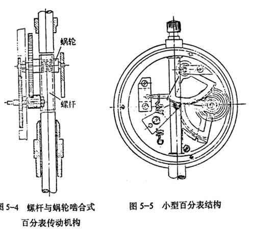 圖5-4.為螺桿與蝸輪嚙合式百分表的傳動機構.它的第一級為帶有螺旋線的螺桿與蝸輪傳動.這種表的刻度盤一般是不可轉動的,調零靠旋旋轉螺桿來實現,