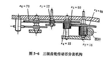 圖5-5是小型百分表的結構,由于表體尺寸小,多用扇形齒輪代替整圓齒輪.它的示值范圍小,一般為0~3毫米.這種百分表的結構形式,傳動方式,工作原理等與普通百分表相同.圖5-6是一種三級傳動的小型百分表傳動機構.它具有三個齒輪副,特點是傳動比大(K=232),因此刻線間距也大,讀數精度也高.