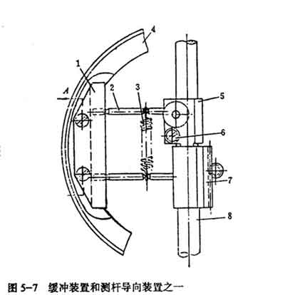 (一)緩沖裝置 當百分表測桿受到突然沖擊時,測桿上的齒輪的嚙合點瞬時受力很大,容易損壞齒輪,為克服這一缺陷,有的百分表采用了圖5-7所示的緩沖裝置.圖中固定塊5由螺釘6固定在測桿8上,齒條7可以在測桿上滑動,并借助拉力彈簧3緊密地靠在固定塊上,當測桿向上急速運動時,如果作用力大于彈簧的拉力,測桿與齒條便發生相對運動,產生緩沖作用,避免齒輪受損.