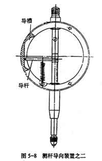 (二)測桿導向裝置 測桿導向的方式很多,除圖5-3所示的以外,常見的還有圖5-7到圖5-15所示的幾種.在圖5-7中,采用雙導桿2導向.導桿的一端插入導槽塊1的導槽中,另一端分別與固定塊5和齒條7連接.導槽塊由三塊組成,用螺釘固定在表體4上(見A-A局部社圖).此結構導向作用穩定可靠,并且便于調整和修理.在圖5-8中,導槽直接做在表體的內圓上,修理較困難.在圖5-9中,導槽做在表體中部的突臺上.在圖5-10中,用導板代替導桿,導板固定在測桿上.測桿移動時,導板兩端的凸出部分沿著后蓋內表面滑動(圖5-10a),或導板沿著后蓋上兩個凸起的平面導軌滑動(圖5-10b).這種導向裝置的缺點是,卸下后蓋就失去導向作用;優點是容易修理.圖5-11是較理想的一種導向結構.導桿伸進導槽內的一端做成球形,導槽塊可以拆卸,因而修理時容易使導槽與導桿得到良好的配合圖5-12所示結構是用螺釘將導桿夾持在測桿上,導桿的位置可以調節.在圖5-13所示的百分表中,后蓋和表體制成一體,導槽1直接開在后蓋的內平面上,導桿2固定在測桿5上,可沿導槽上下滑動.在圖5-14中,導槽塊4固定在圓座板上,導桿5在導槽中滑動. 圖5-15所示的導向裝置是利用導板5和導槽4導向,其結構與圖5-8相似.